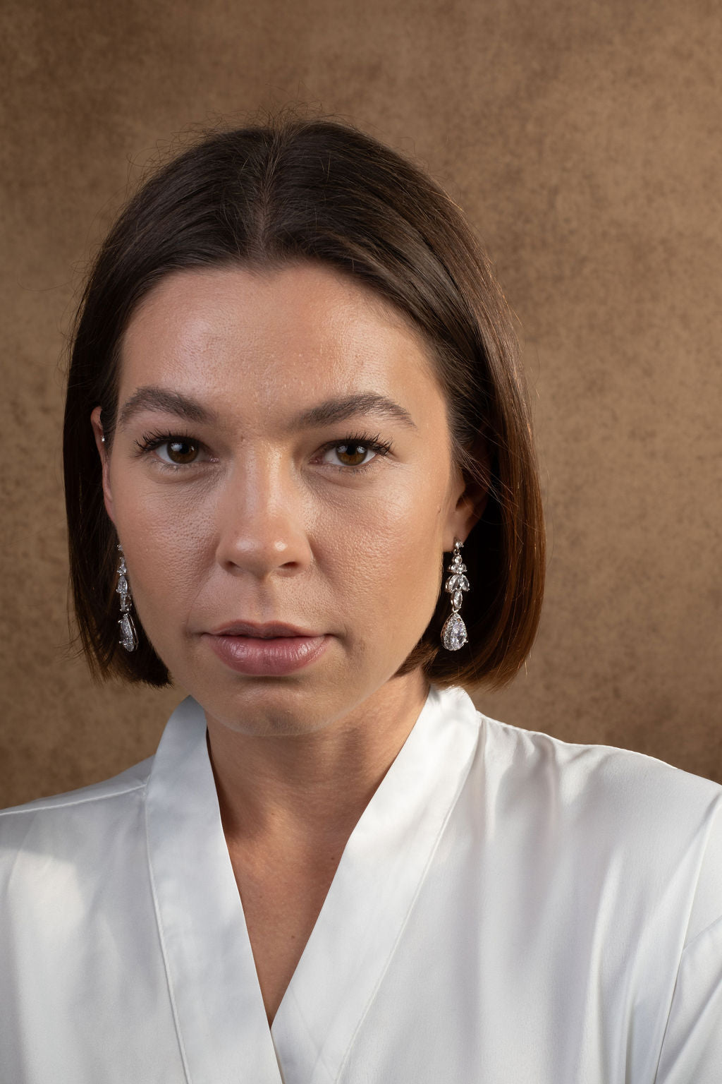 Aretes colgantes de 5.7 cm x 1.5 cm, disponibles en color plata.
