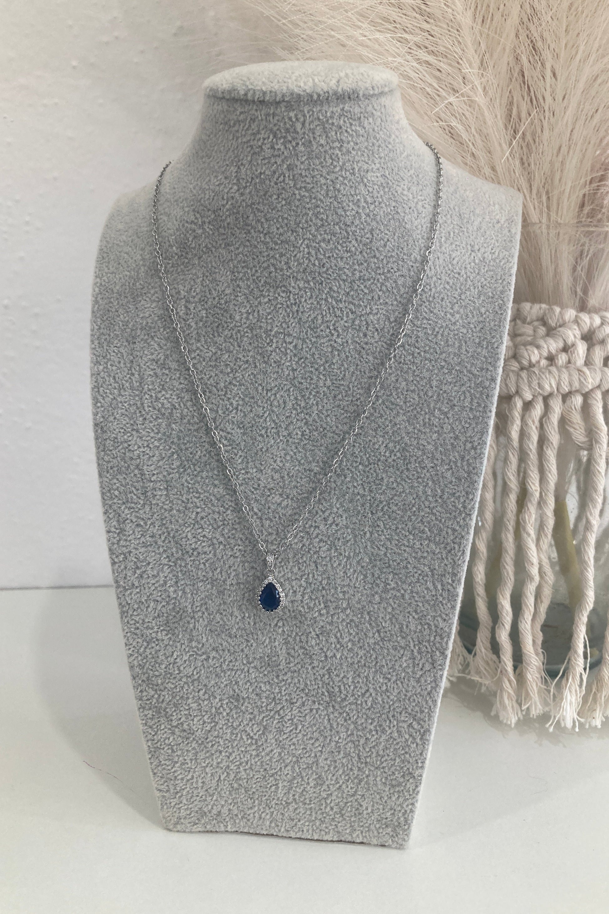 Elaborado con circonia de lujo en un hermoso tono azul y acabado en rodio platinado, este collar no solo es deslumbrante, sino también duradero.