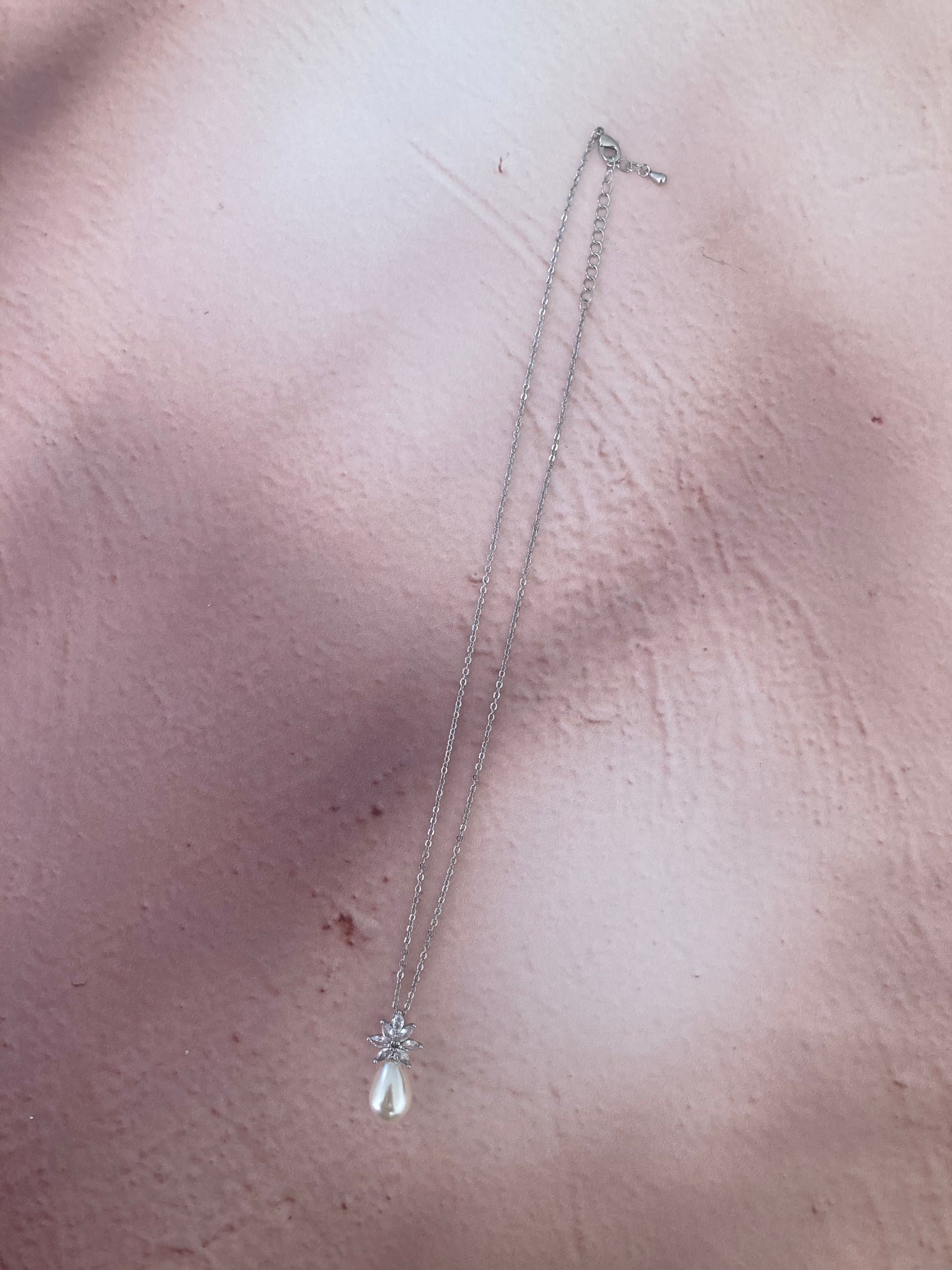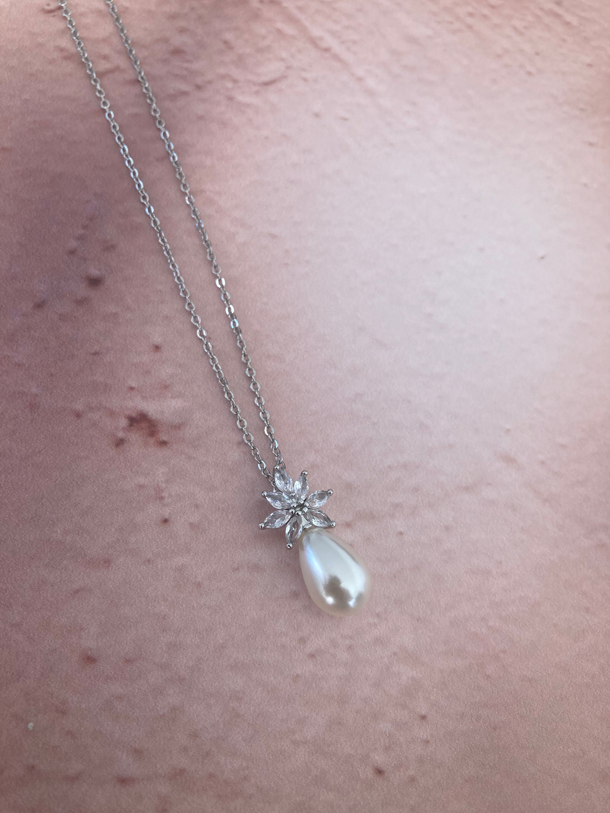 Hermoso collar con colgante de perla sintética en forma de gota y circonia de la mejor calidad. La cadena está bañada en rodio platinado