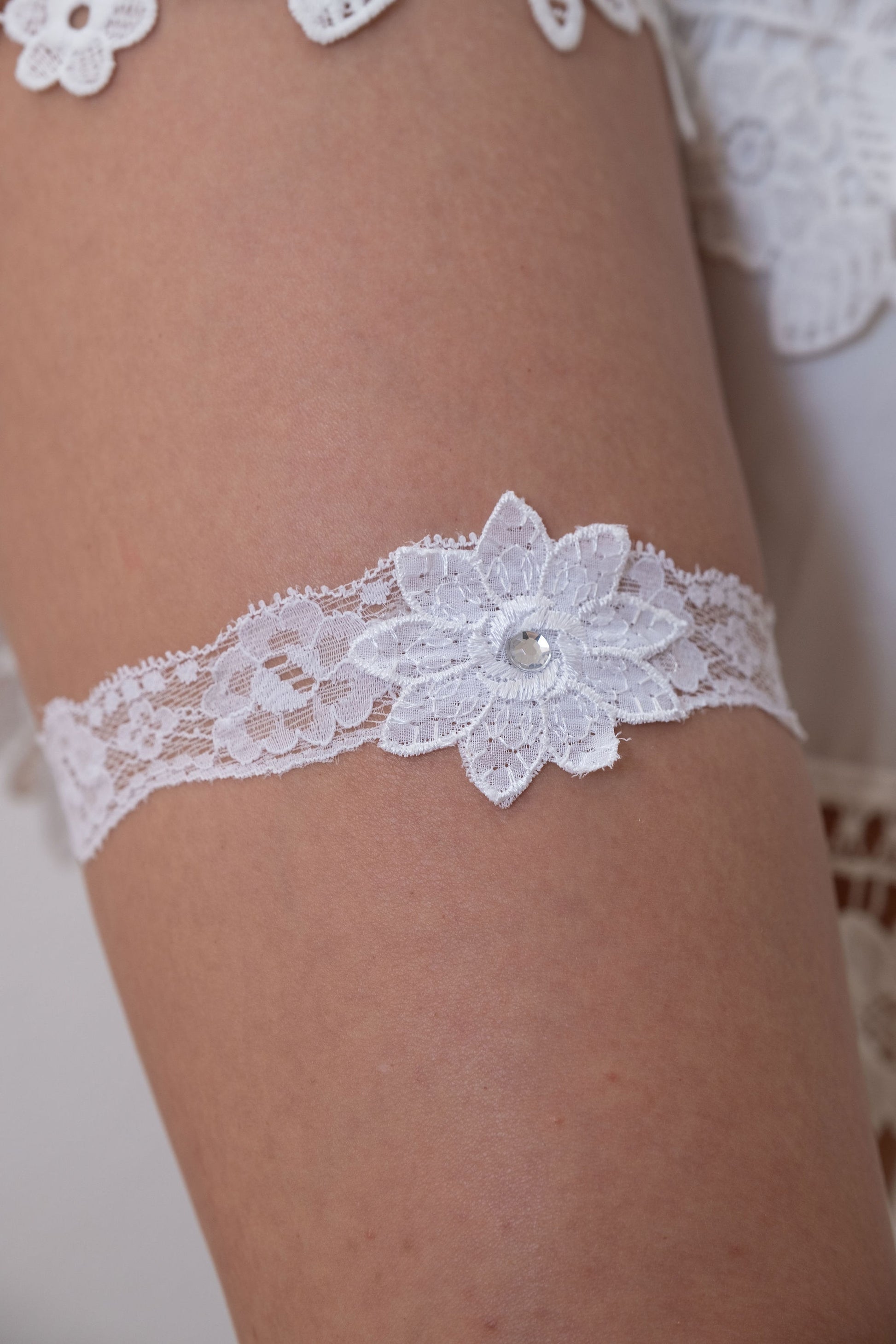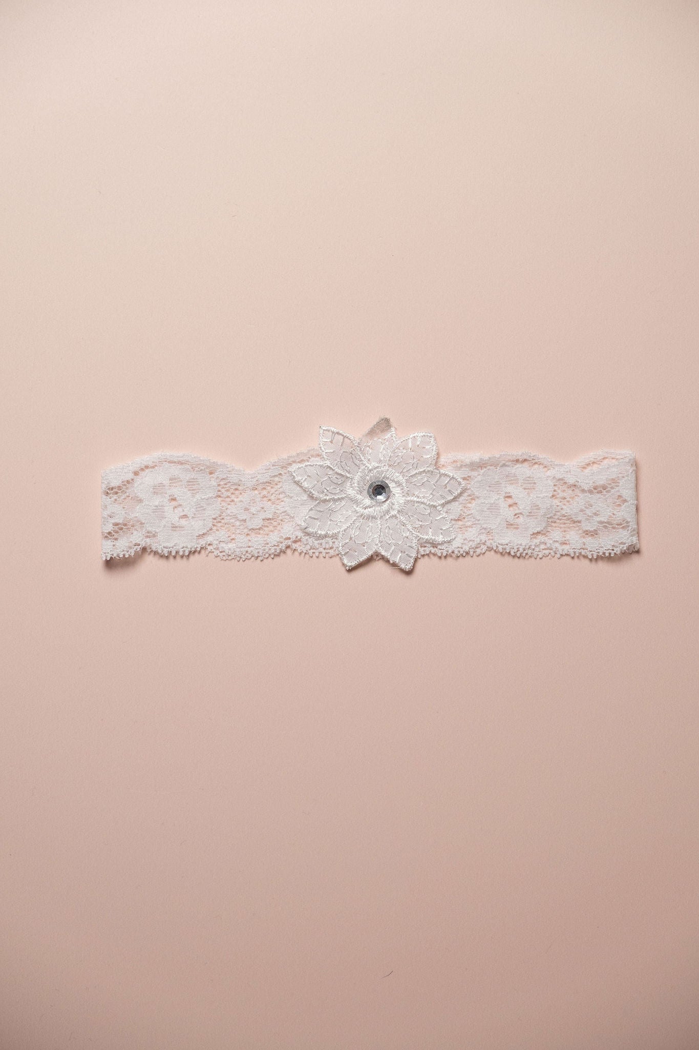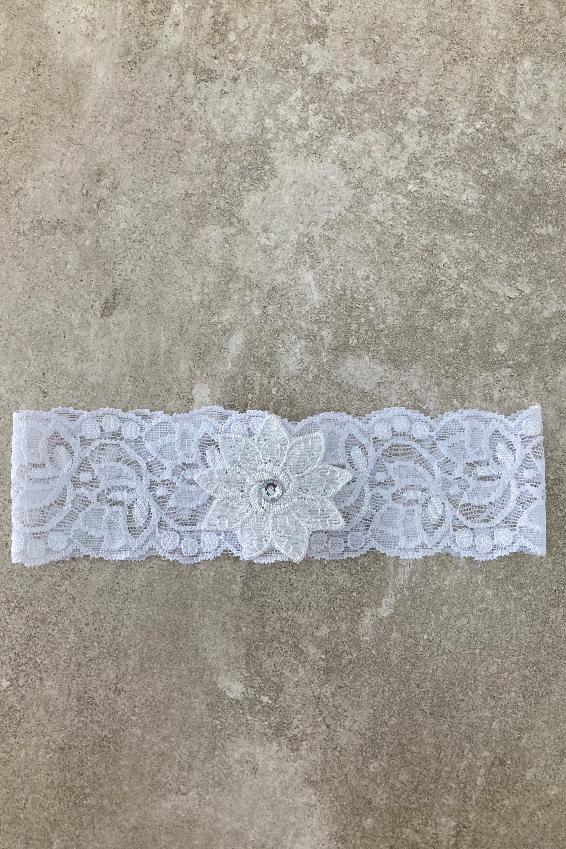 Hermosa liga de encaje spandex con hoja de tela razo y pedrería.