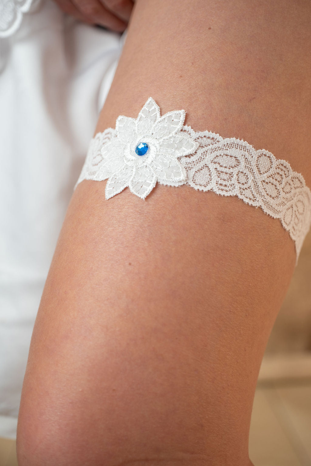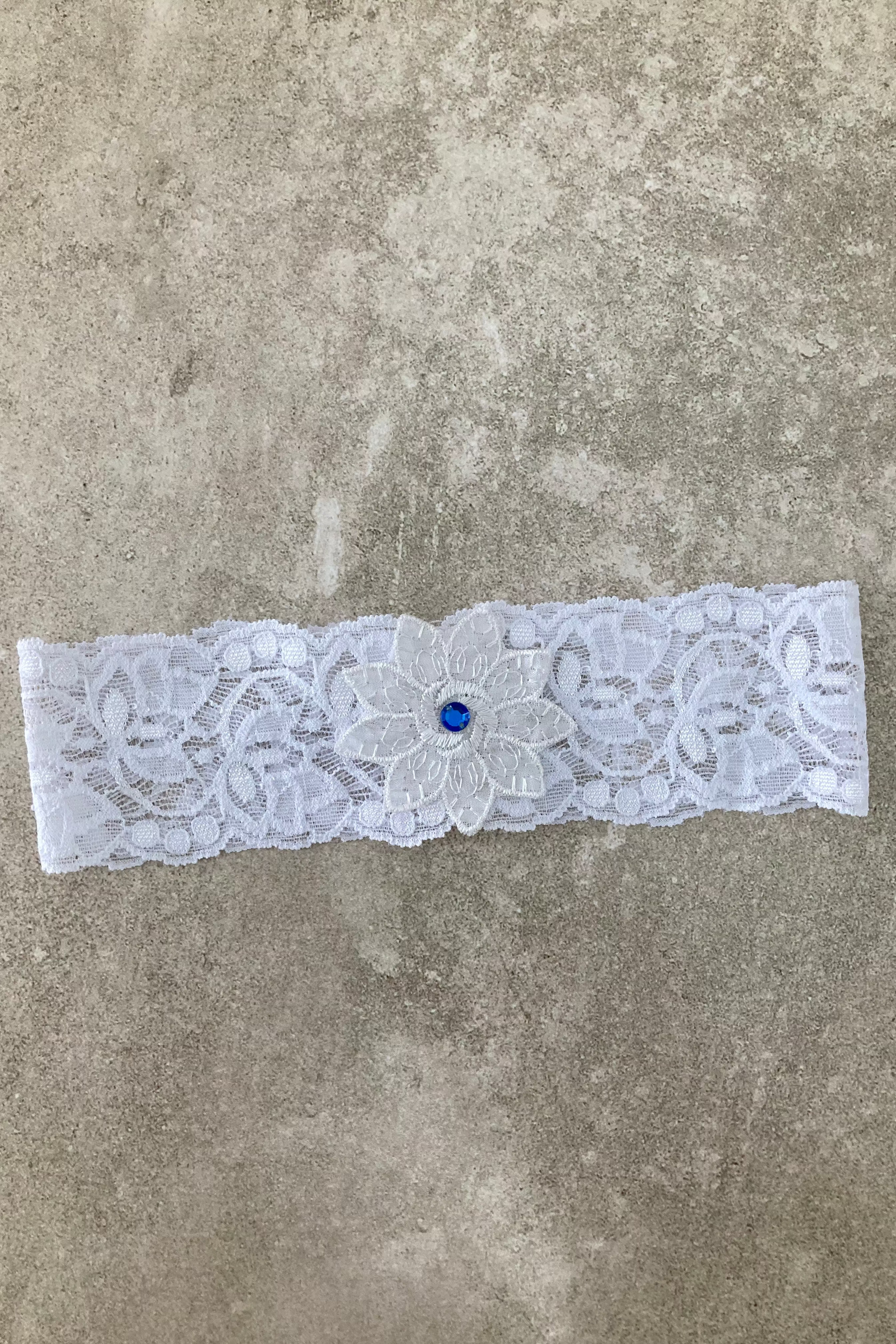 Hermosa liga de encaje spandex con detalles en pedrería azul.