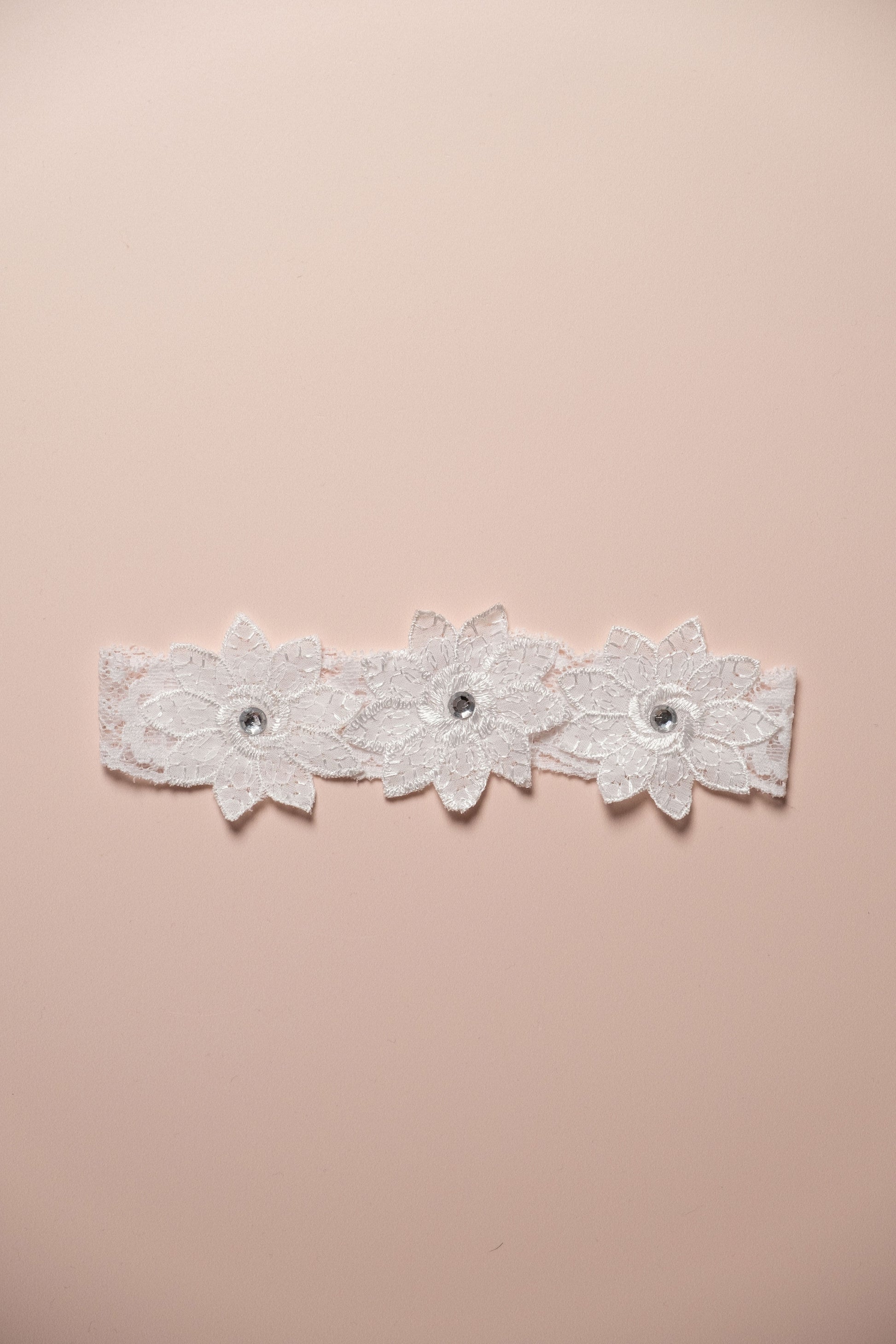 Hermosa liga de encaje spandex con hojas de tela razo y pedrería.