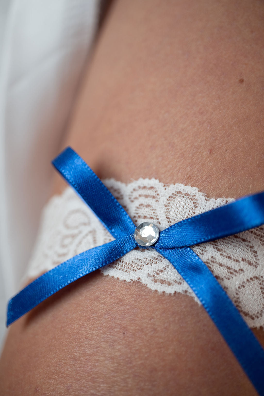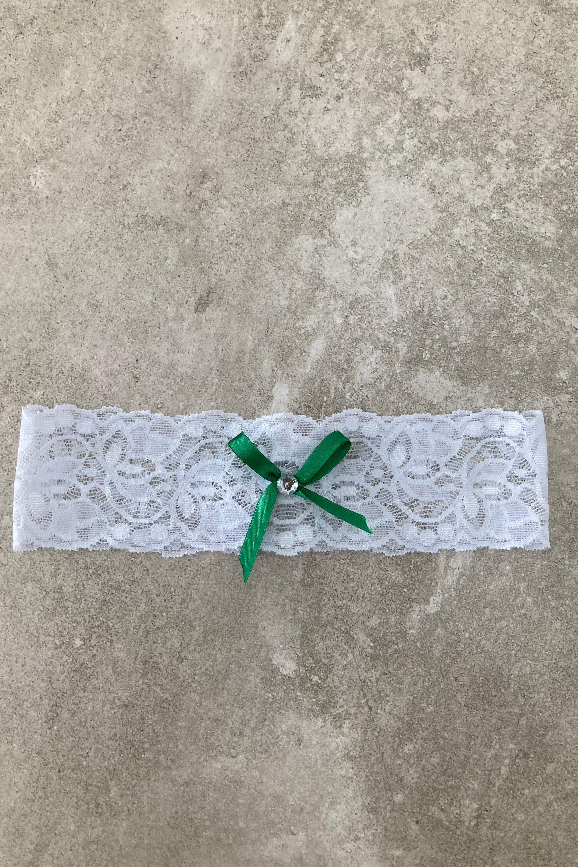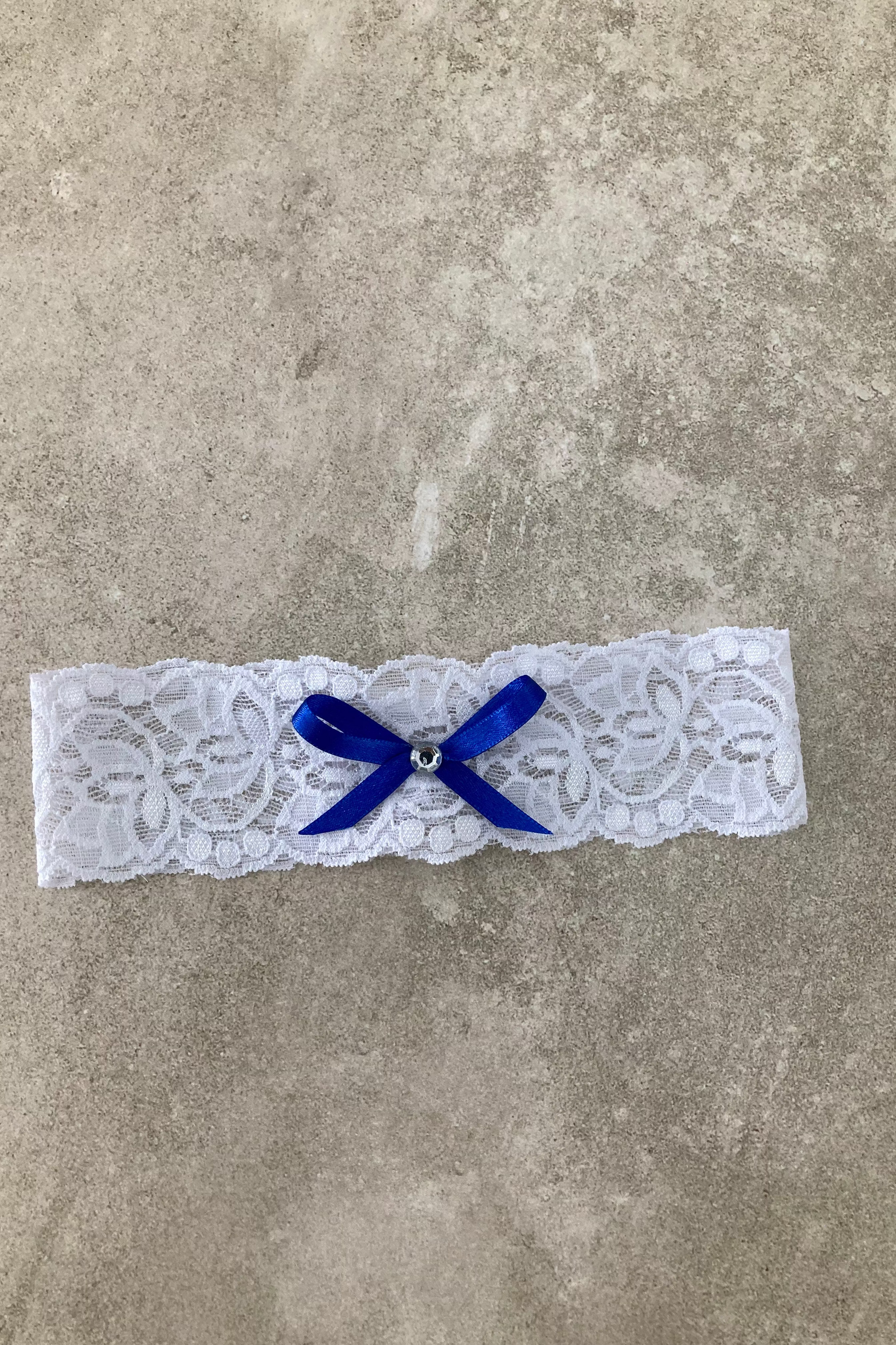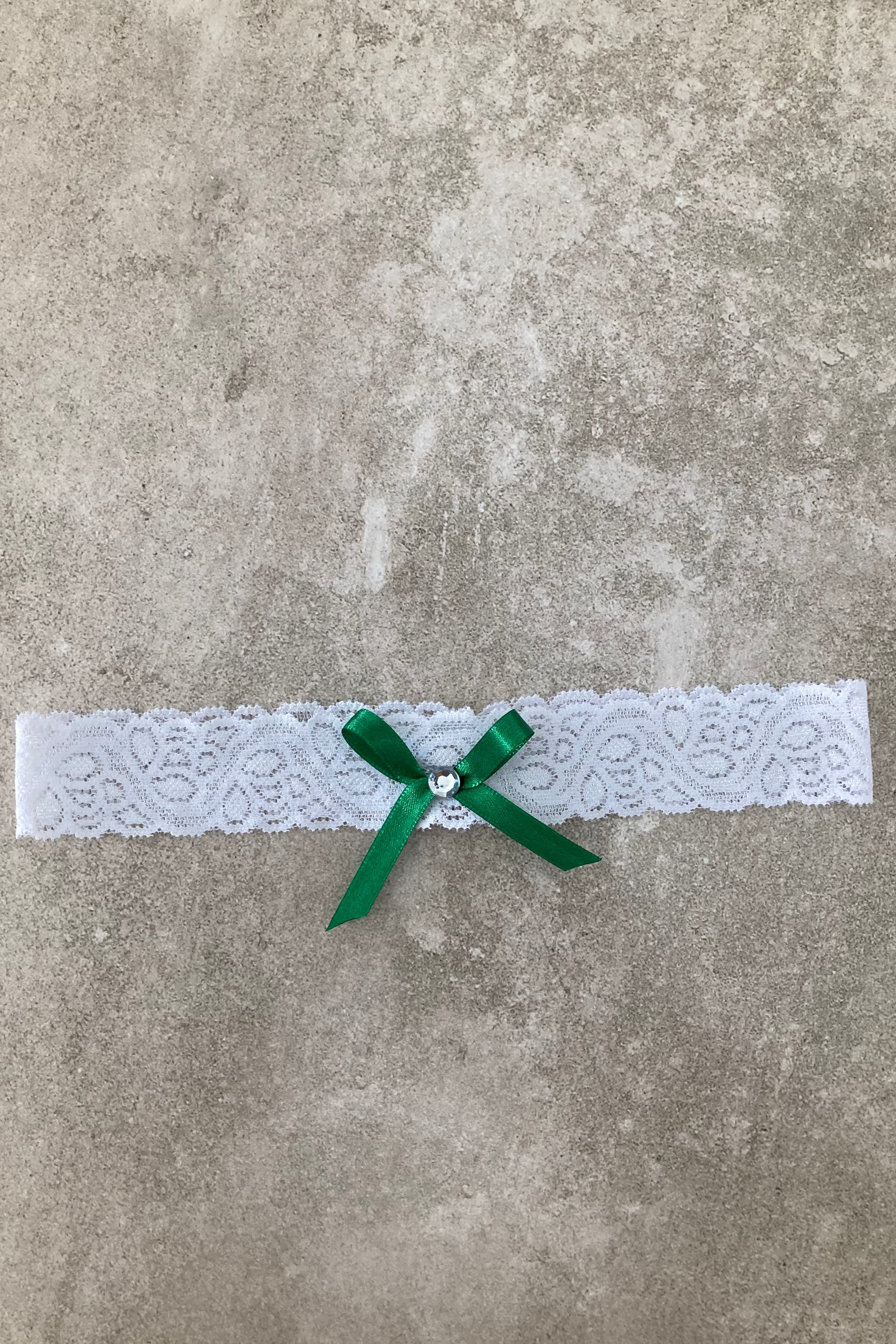 Hermosa liga de encaje spandex con listón en azul rey, azul celeste y verde esmeralda.