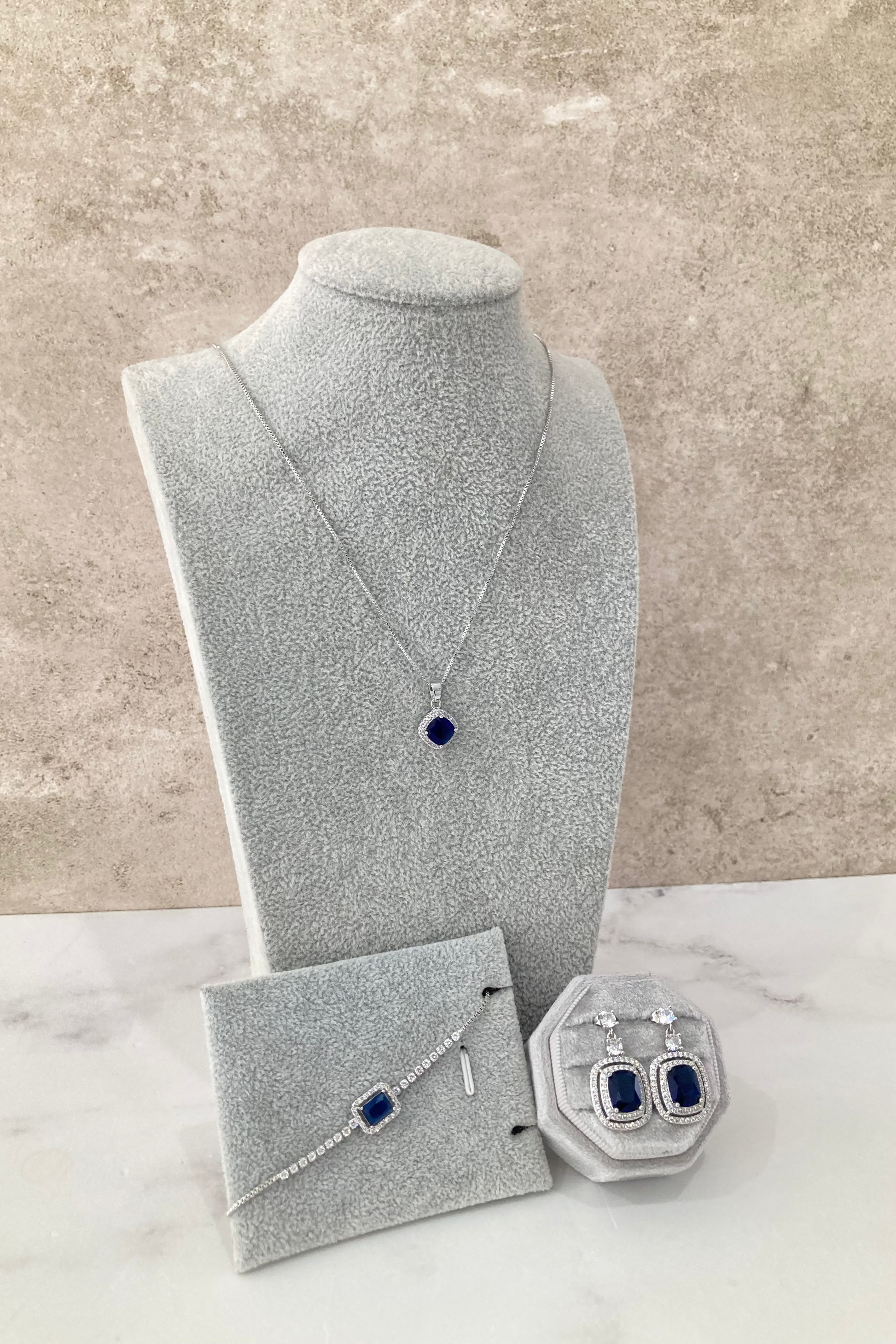 Este set de aretes Ruth, collar Elvira y pulsera Mariana es la elección perfecta para añadir un toque de elegancia y sofisticación a tu tradición "something blue". Con un brillo delicado y refinado, cada pieza realza tu estilo con un encanto sutil que complementa cualquier ocasión especial. Atrévete a brillar con esta joyería que celebra momentos únicos y llenos de significado.