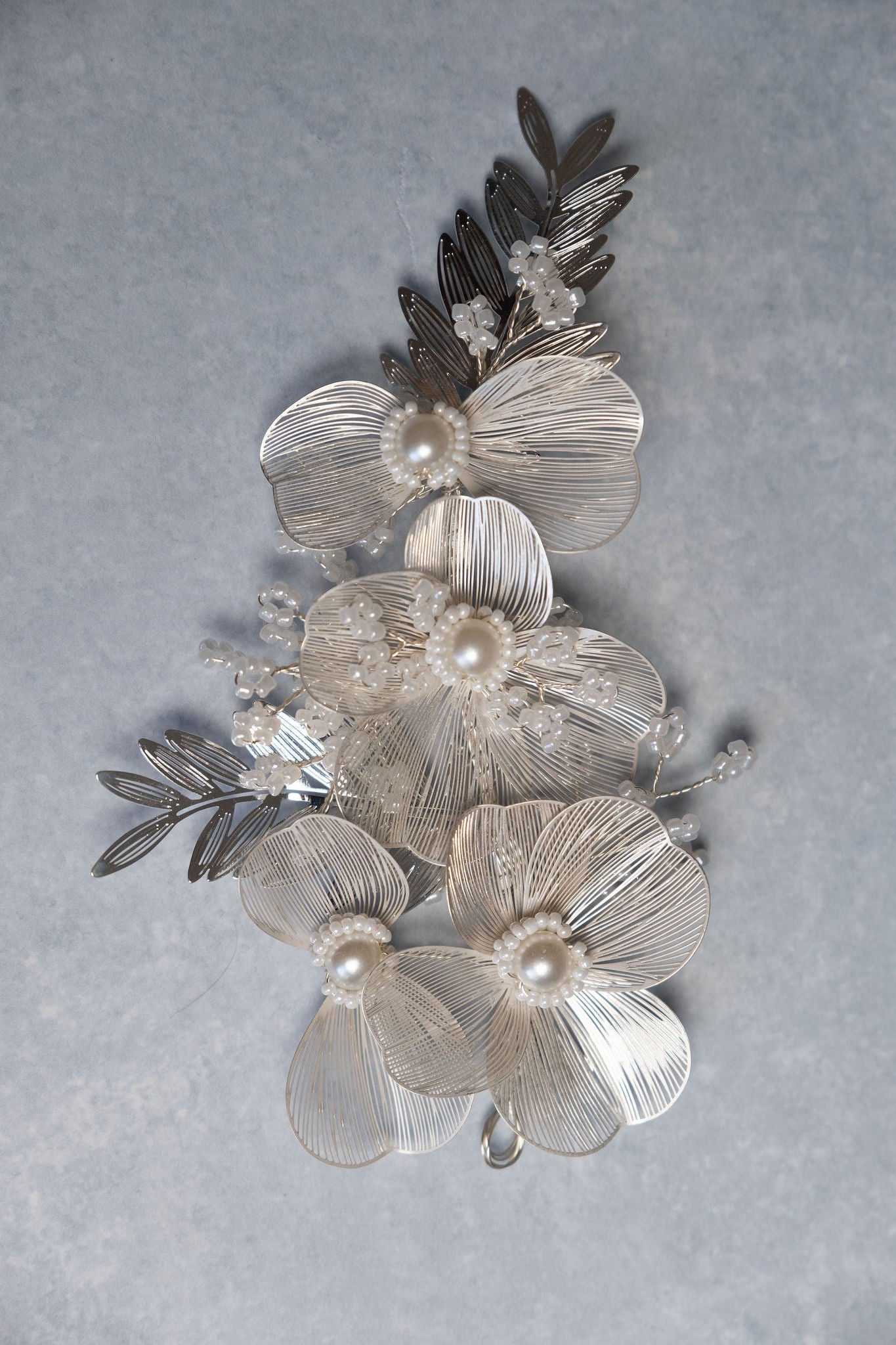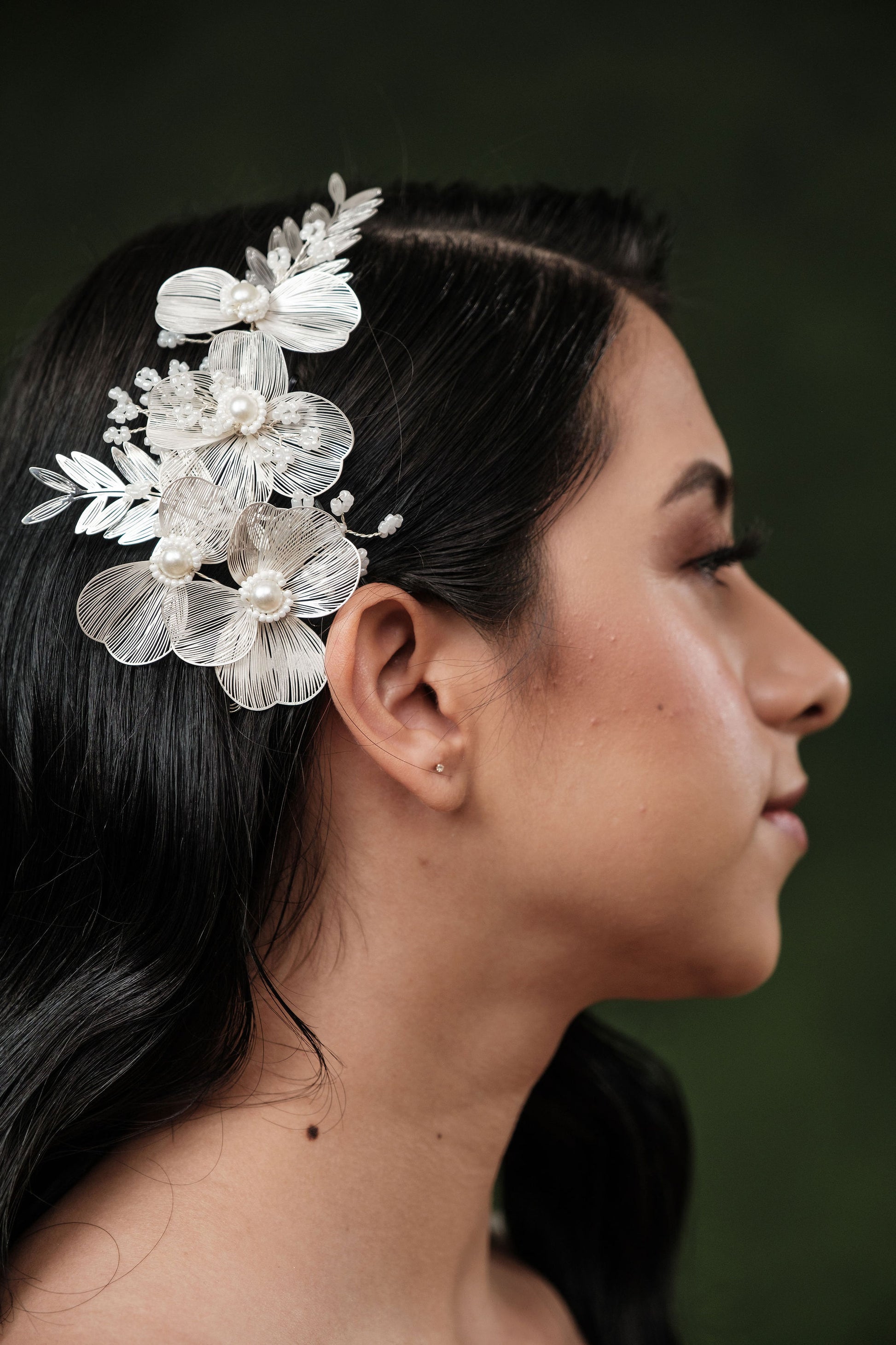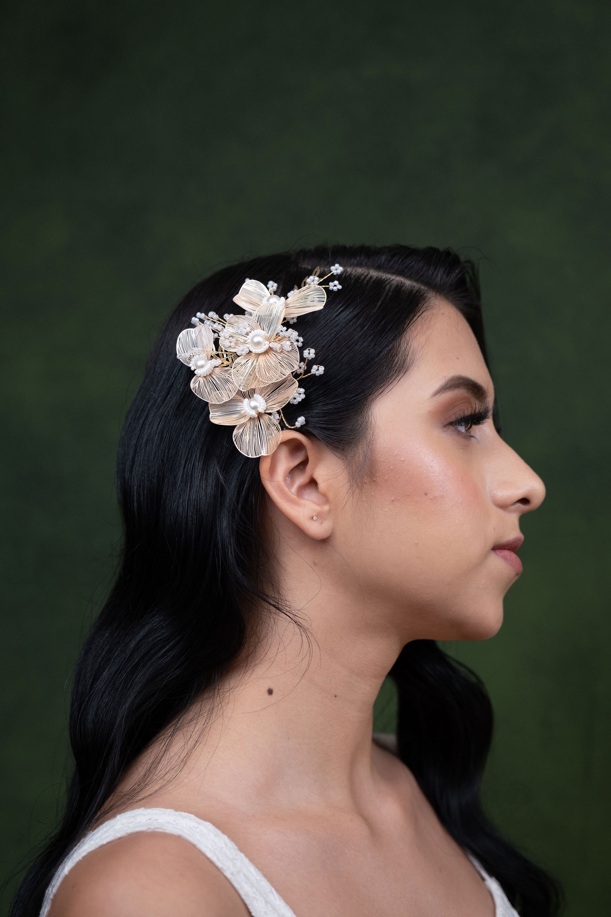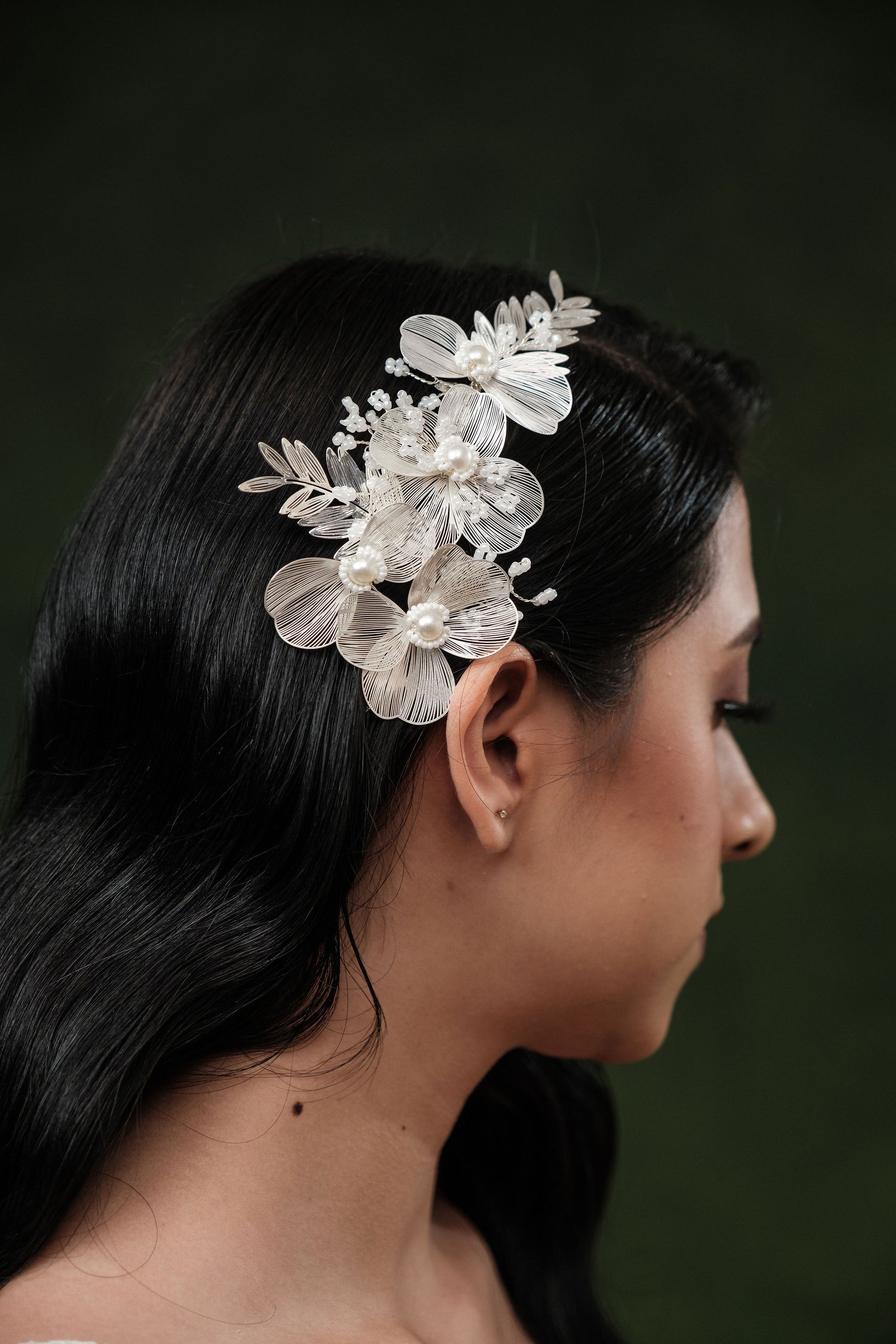 Hermoso tocado estilo floral con perlas ideal para llevarlo con peinado recogido o semi recogido.