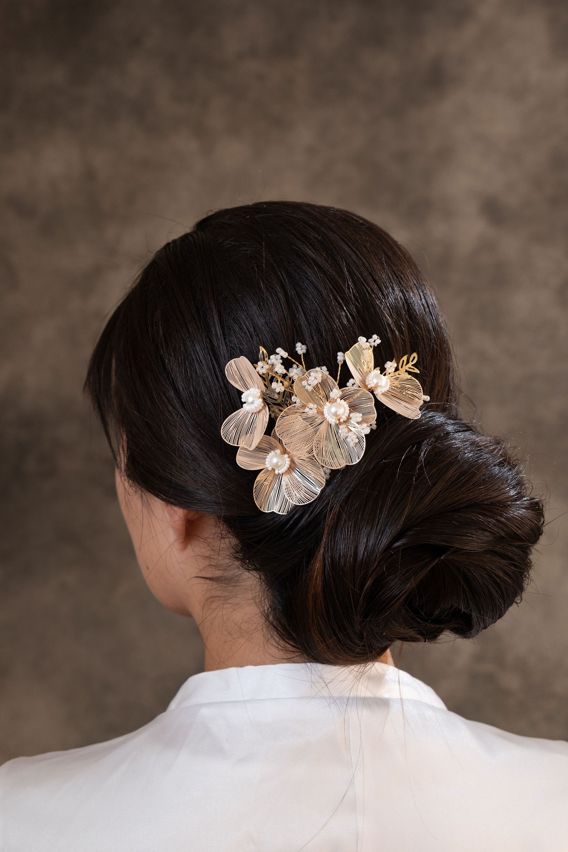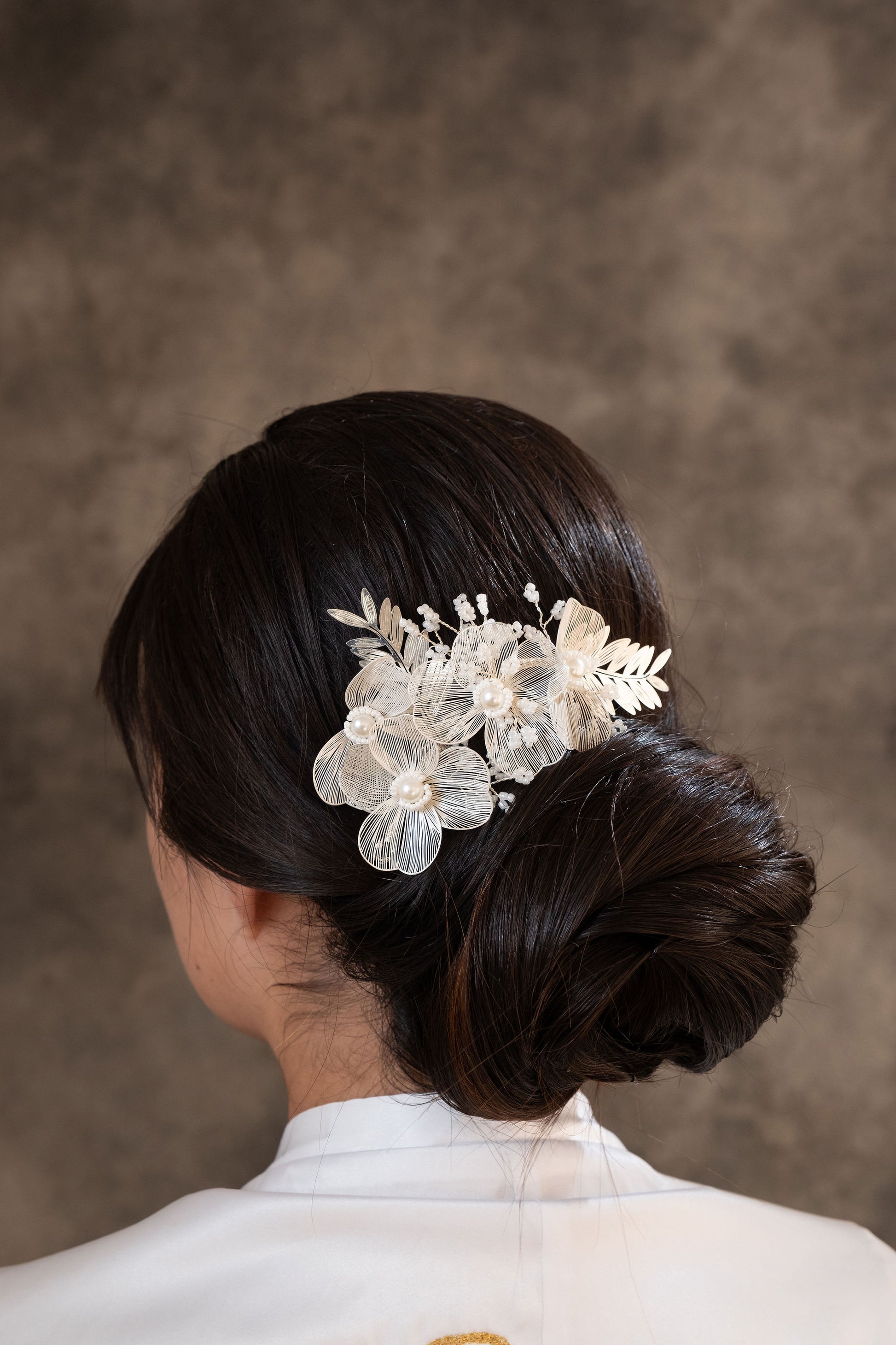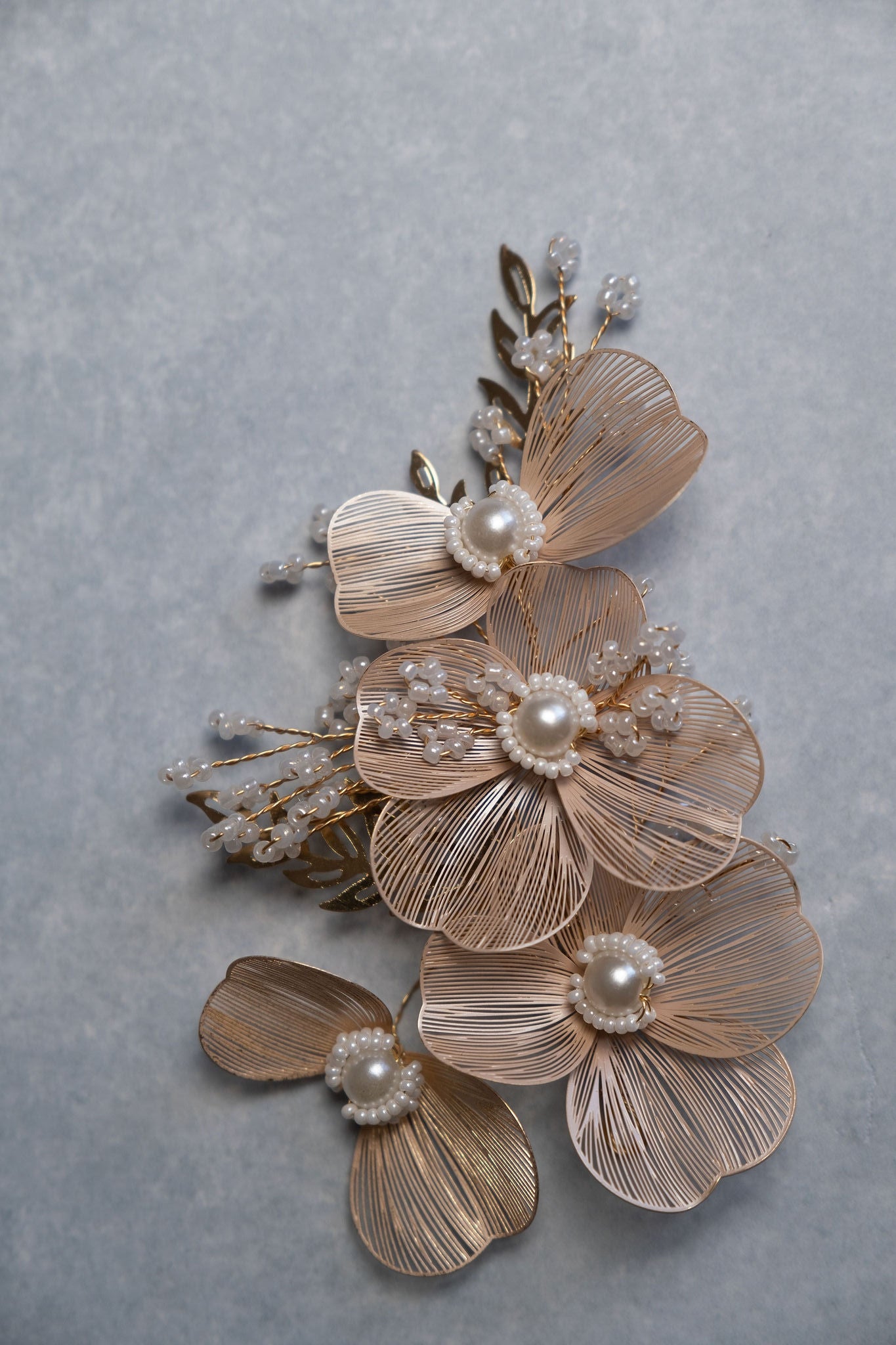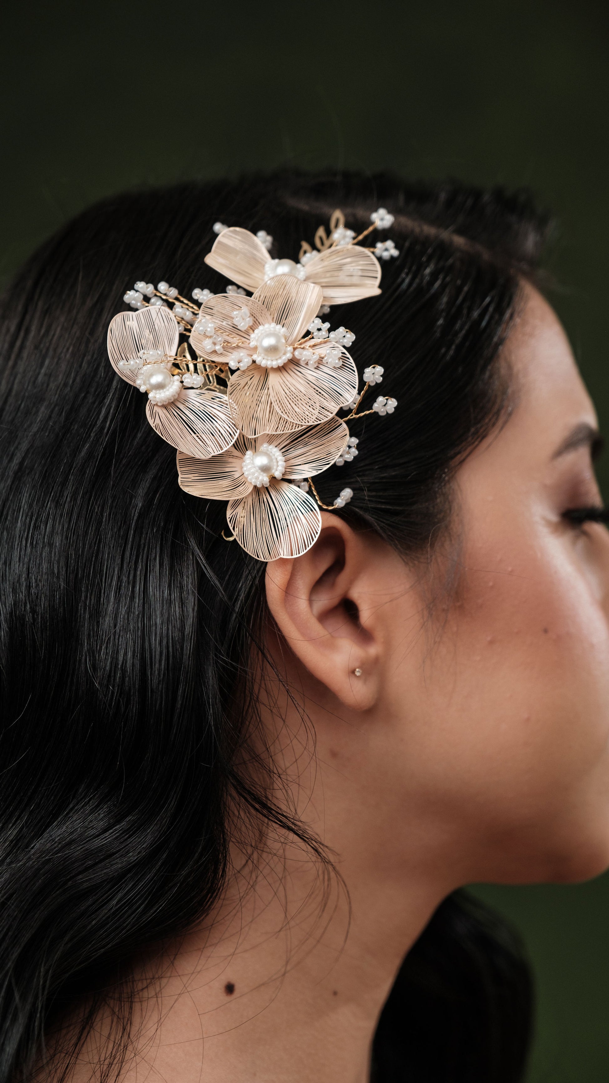 Hermoso tocado estilo floral con perlas ideal para llevarlo con peinado recogido o semi recogido.