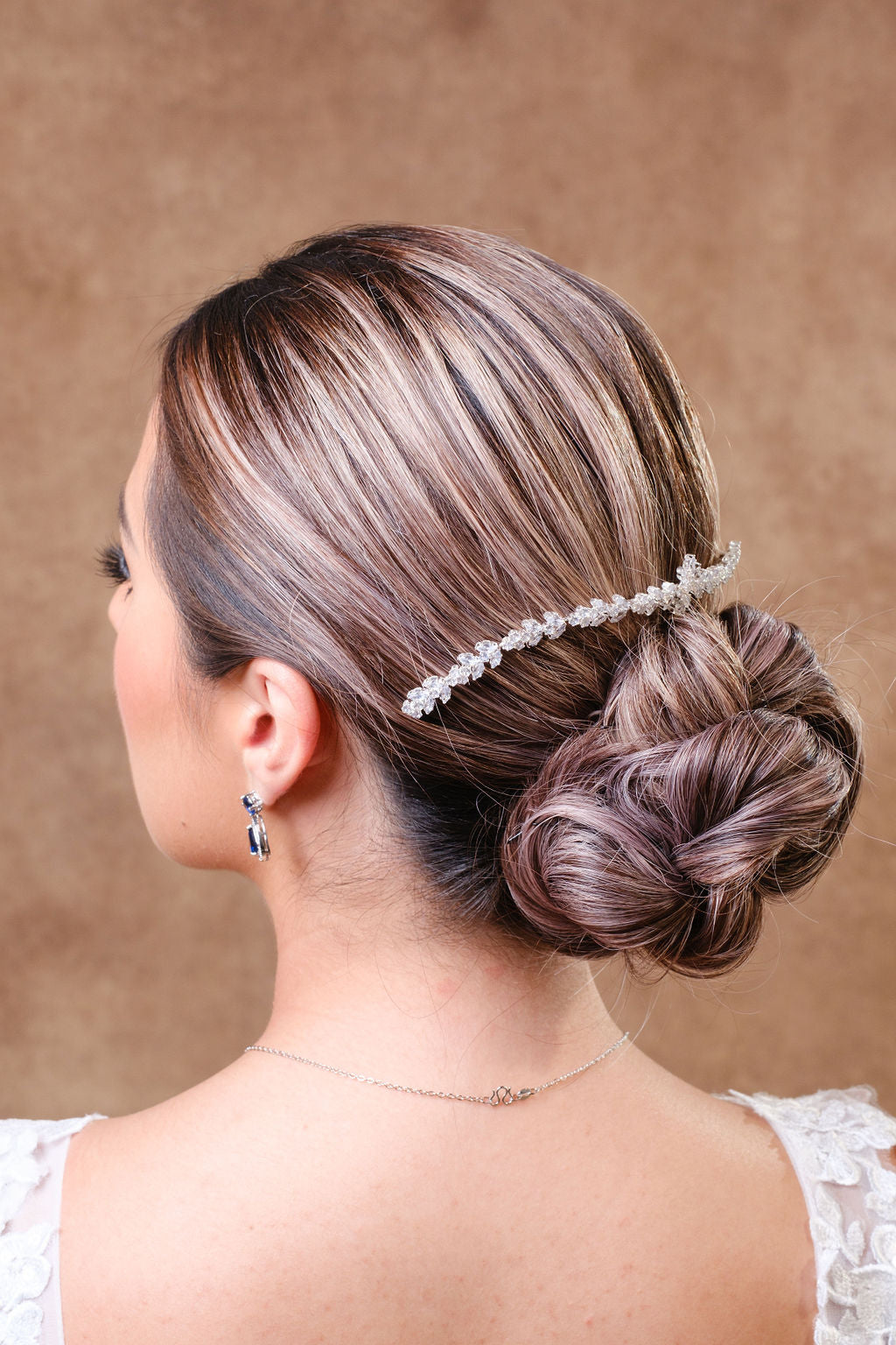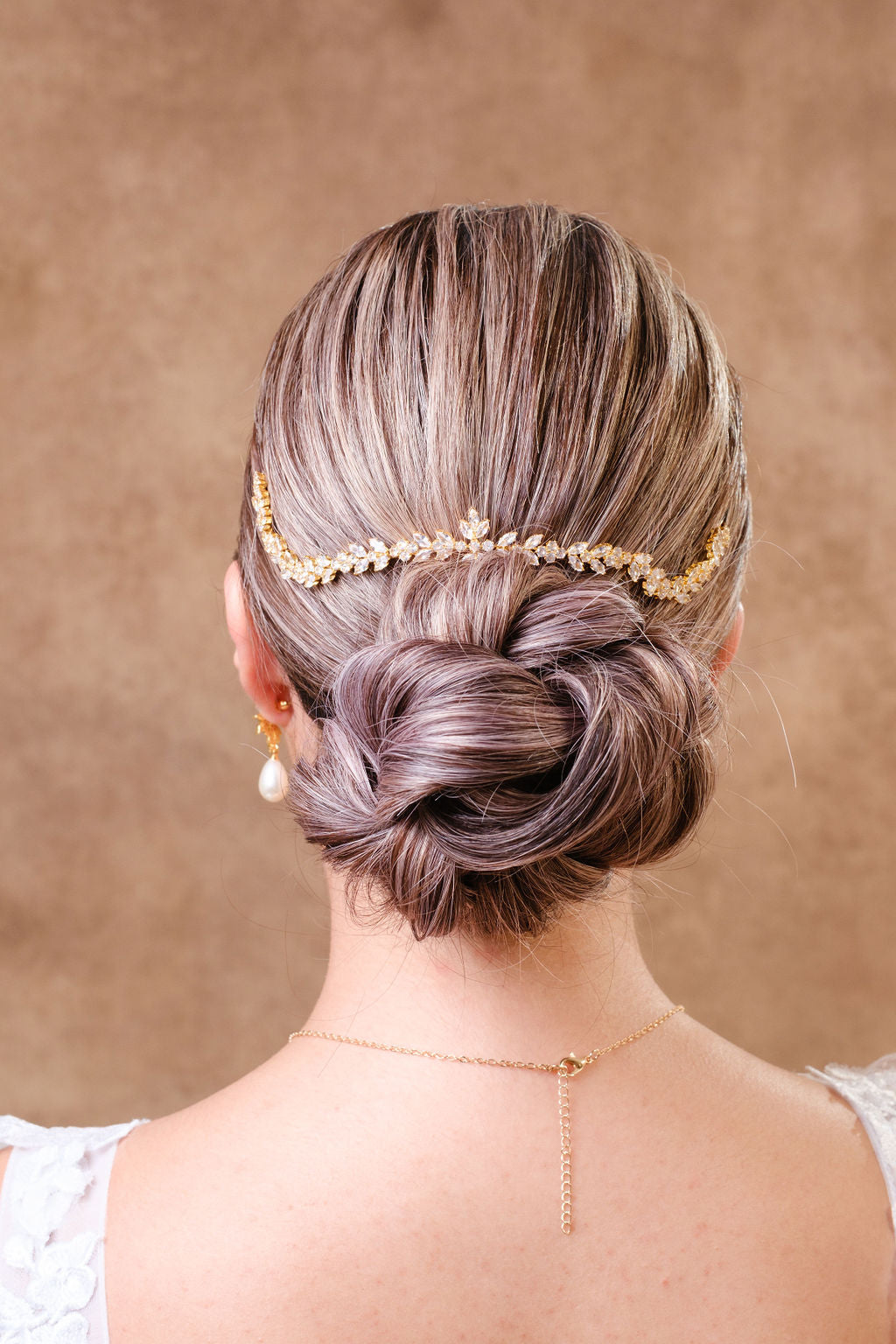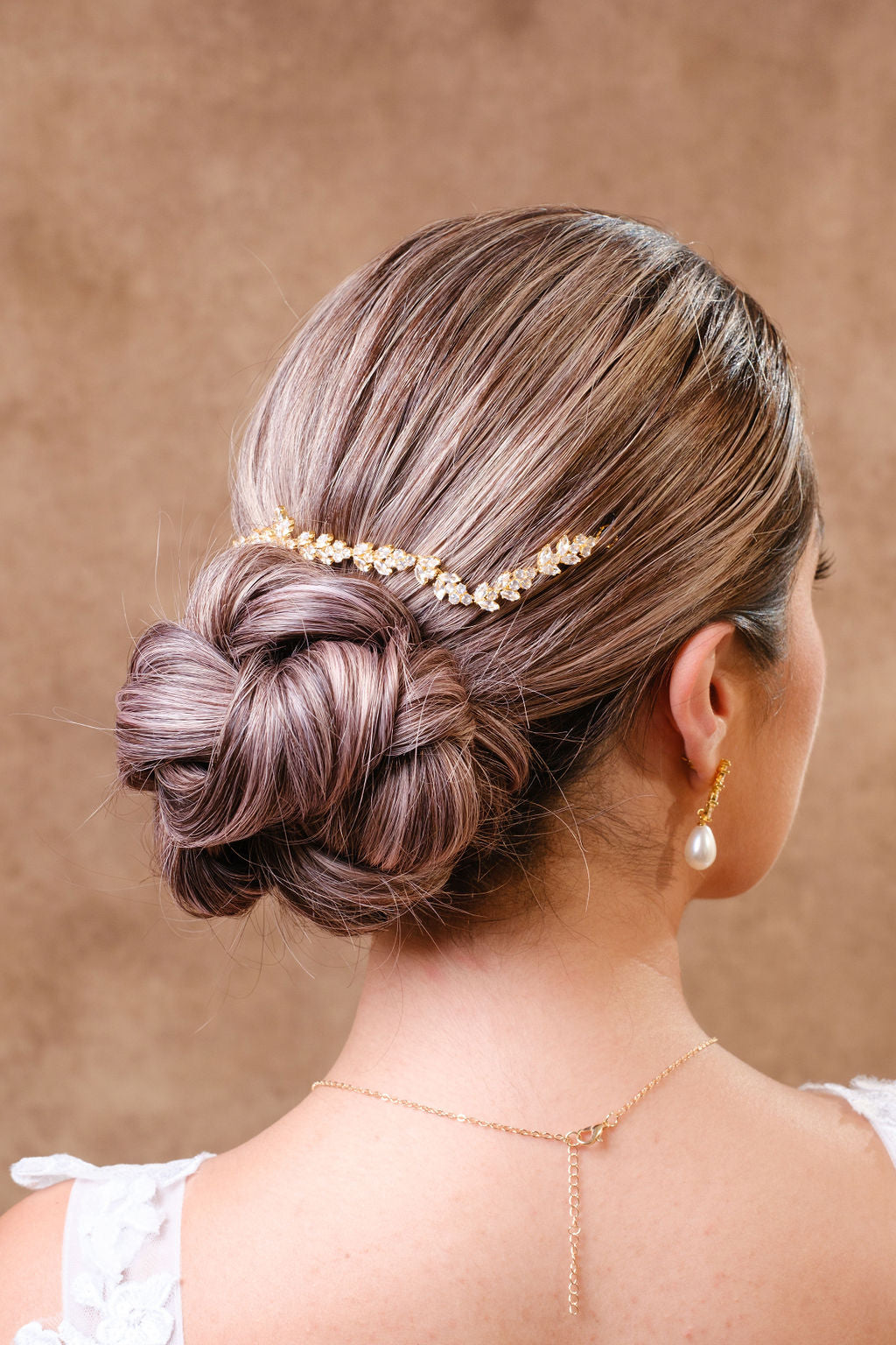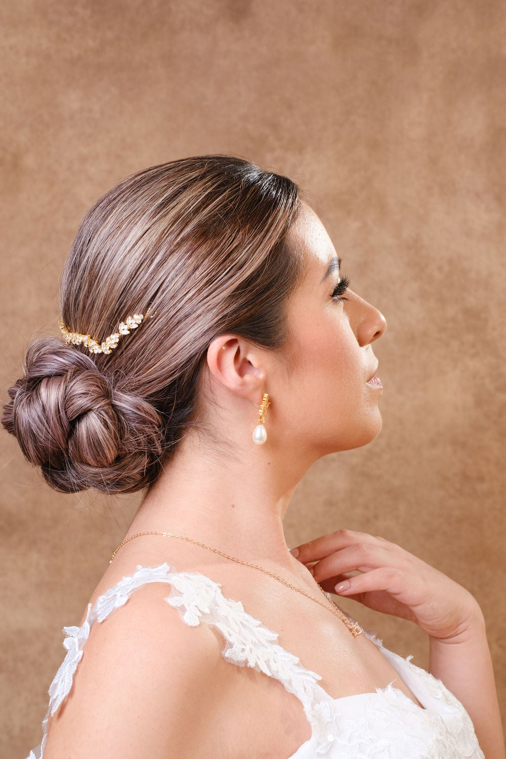 Elegante tocado minimalista con diseño de hojas, disponible en plata y dorado.