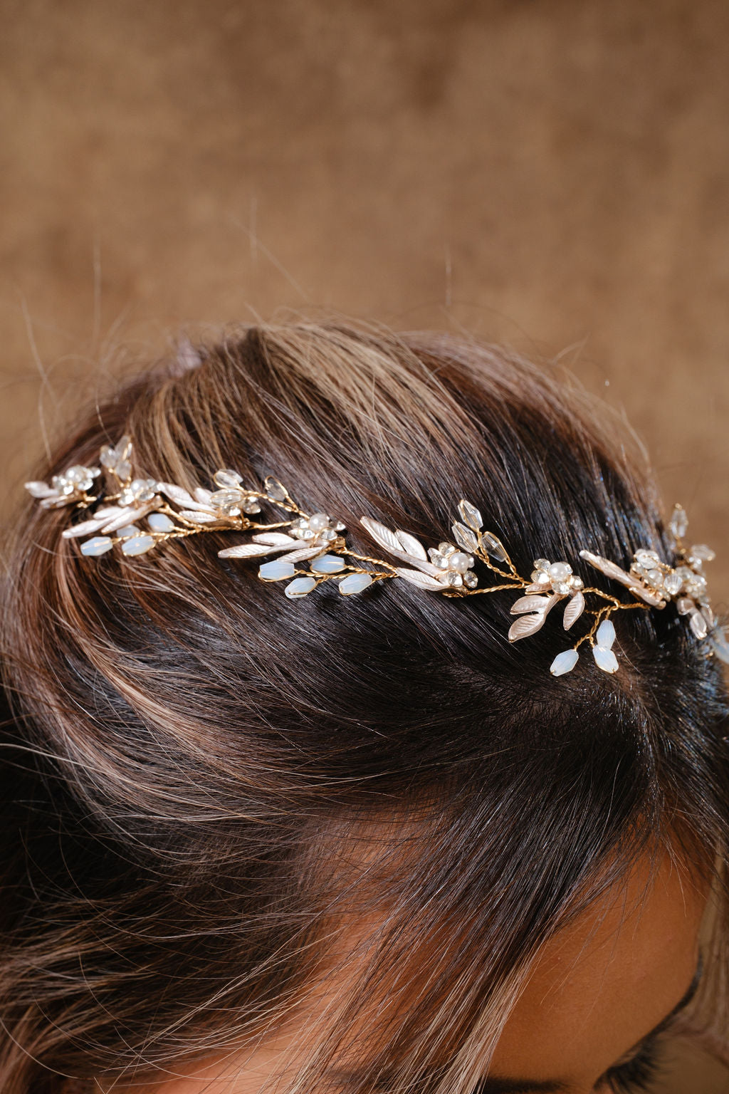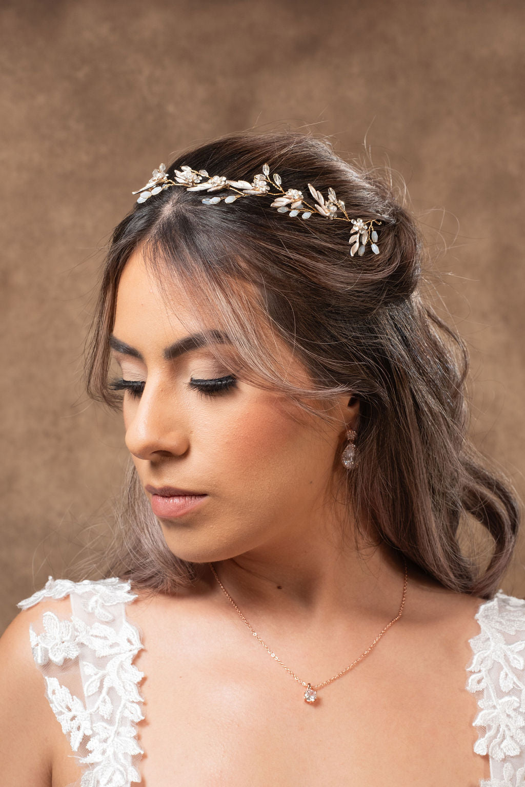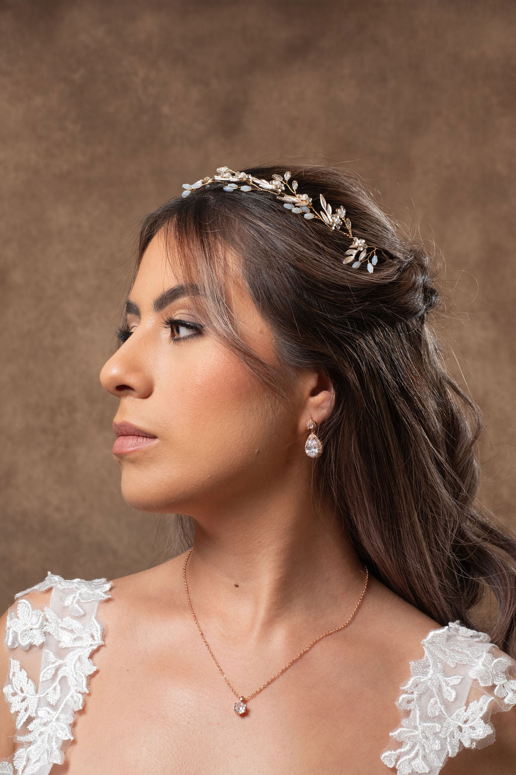 Delicado tocado tipo guía flexible disponible en color dorado y plata. De uso versátil