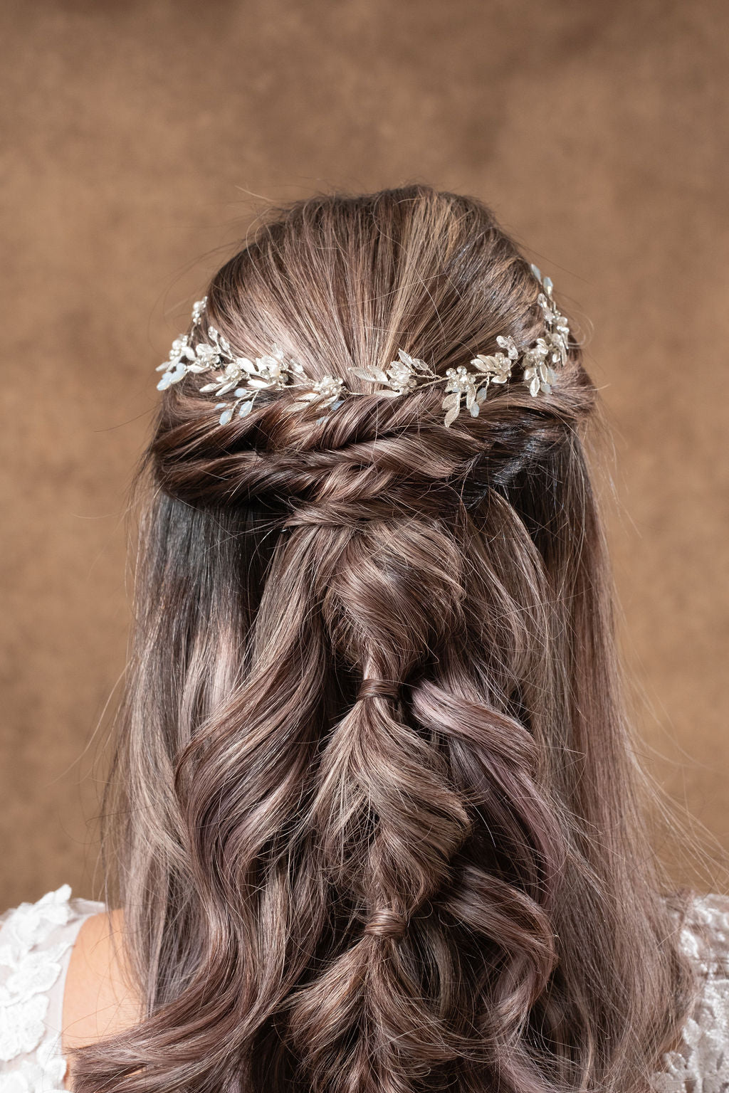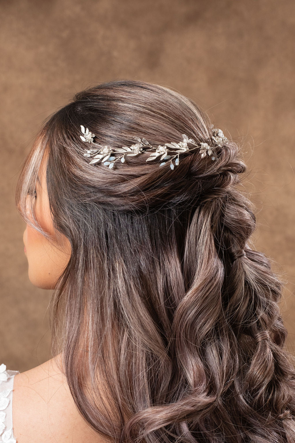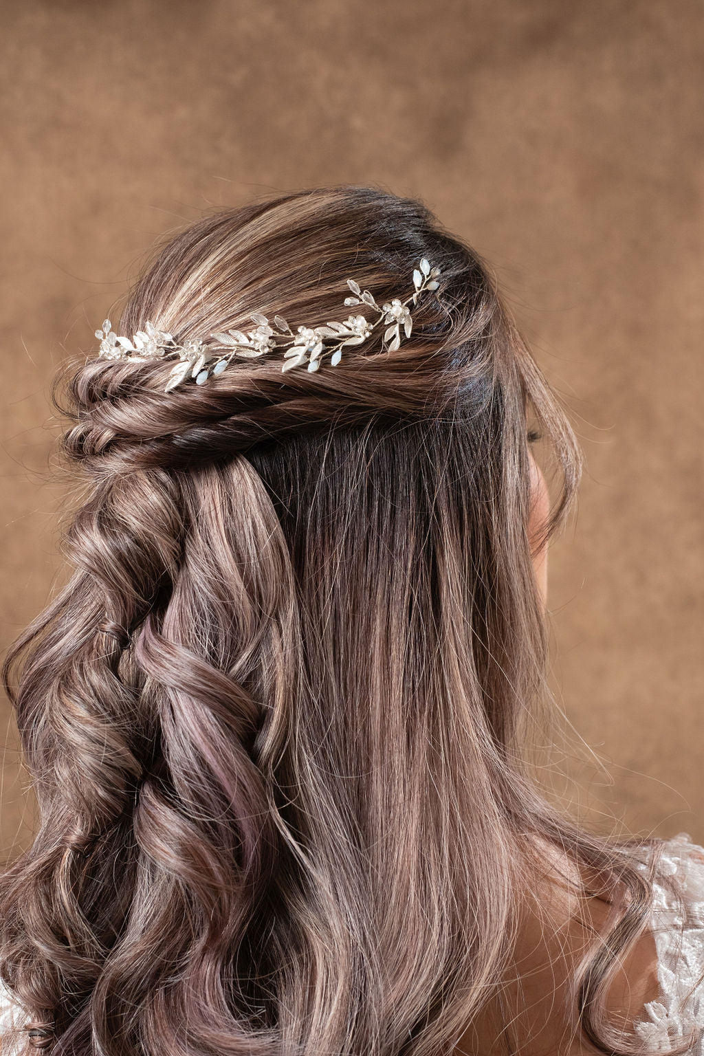 Delicado tocado tipo guía flexible disponible en color dorado y plata. De uso versátil