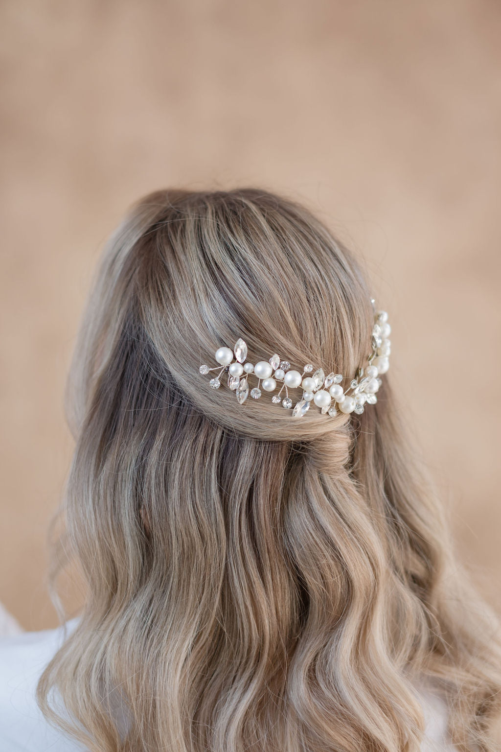 Delicado tocado tipo guía flexible con decoración de perlas sintéticas