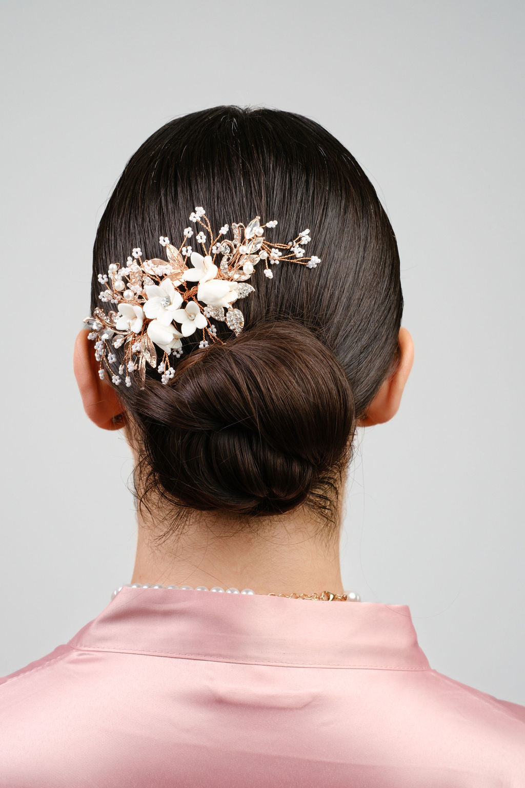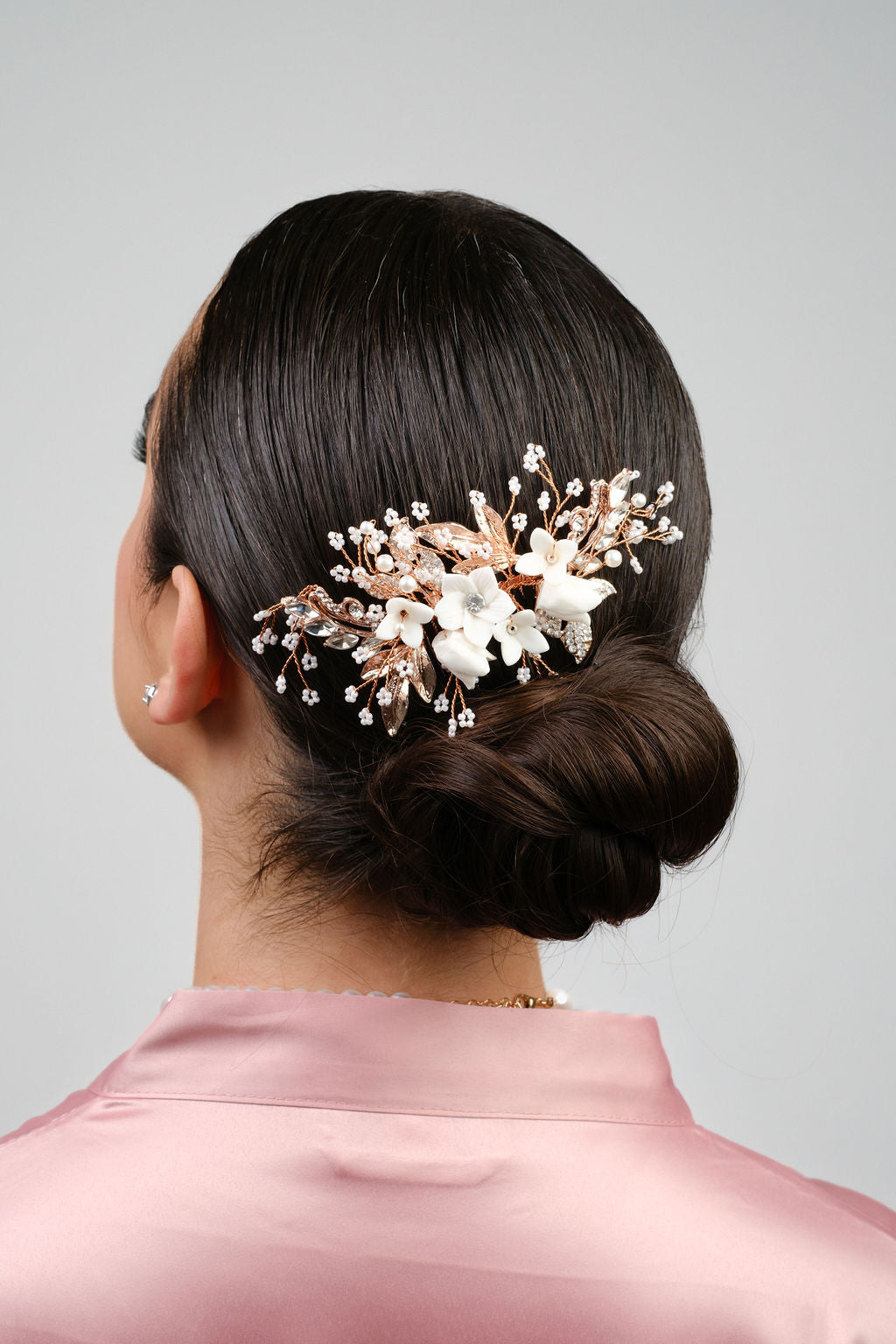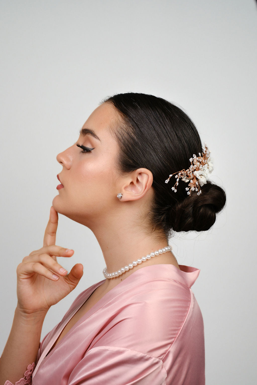 Esta peineta de novia en tono oro rosa y blanco tiene un elegante estilo floral que te hará sentir como una verdadera princesa. Agrega un toque de glamour a tu look nupcial con esta pieza única.